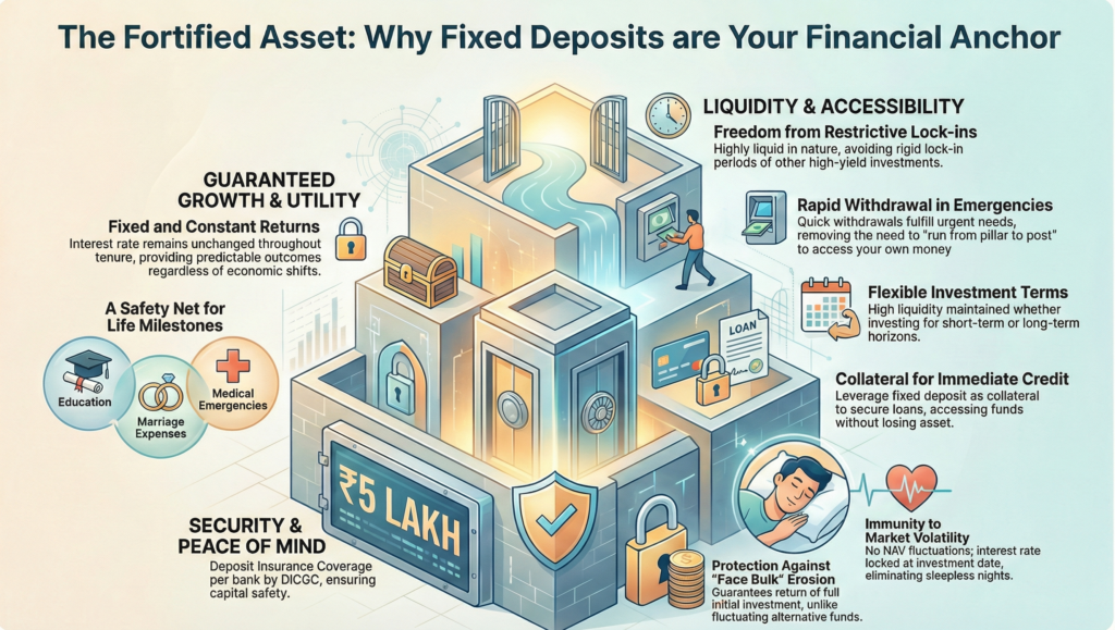 - Guaranteed Returns: A fixed deposit (FD) is a secure investment. It can be used as a safety net for the future needs, such as a child’s education or marriage, or medical emergency. Furthermore, you can also secure a loan against the collateral of your fixed deposit. The interest rate is fixed at the time of opening and remains constant throughout the entire tenure, providing predictable returns and insulation from market volatility.
