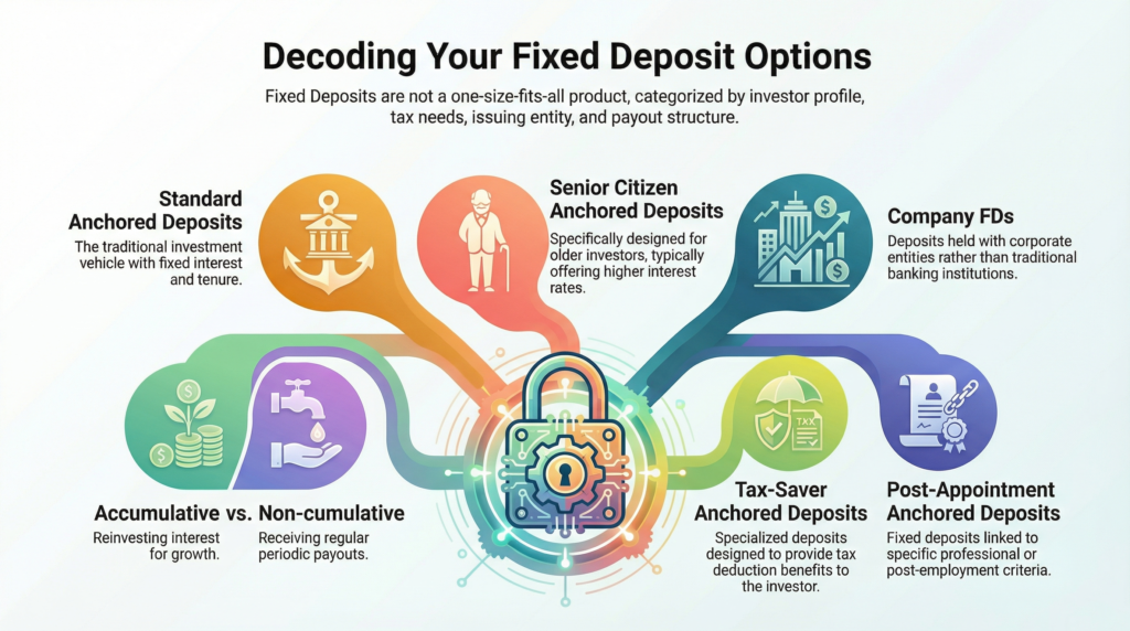 | Fixed Deposit Type | Interest Payment Schedule | Tenure Range | Risk Profile | Primary Providers |
