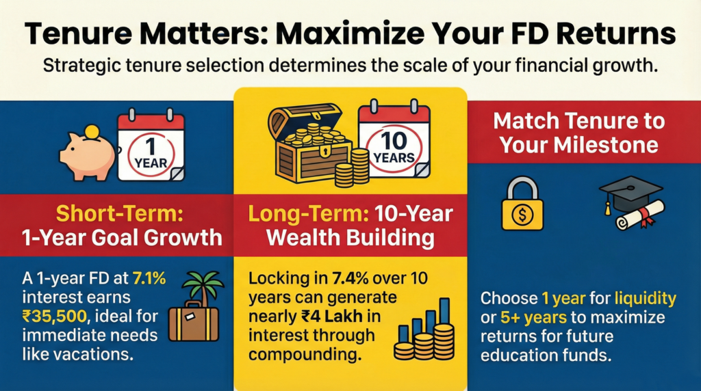 - Flexible Tenure: FDs can be opened for diverse periods, ranging from a short 7 days up to 10 years.